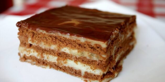 Шоколадно-банановый торт без выпечки Благодаря нежному заварному крему и бананам, печенье полностью пропитывается и становится похожим на бисквит. Ингредиенты: Приготовление Отделите желтки от белков и разотрите их с обычным и ванильным сахаром. Если масса получается слишком густая, добавьте две-три столовые ложки молока. Когда масса побелеет, аккуратно, постоянно помешивая, всыпьте муку. Нагрейте, но не кипятите молоко. Не переставая мешать, влейте его в яичную смесь. Яично-молочную массу перелейте в сотейник и варите на слабом огне, пока не загустеет. Крем нужно непрерывно мешать. Снимите с огня, добавьте сливочное масло, перемешайте. Возьмите форму с бортиками и заполните её дно остывшим кремом. На него выложите слой печенья. Если форма круглая, а печенья квадратные, разламывайте их. После пропитки это будет незаметно.Покройте печенье слоем крема, а затем — слоем нарезанных тонкими пластинками бананов. Повторяйте, пока не достигнете края формы. Последний слой должен быть кремовым. П