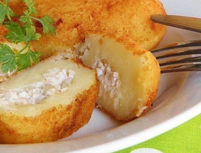 Ингредиенты: Картофель — 900 г Куриное филе — 400 г Яйцо — 1 шт. Лук — 2 шт. Мука пшеничная — 3 ст. л. Масло рафинированное — 150 мл Соль — по вкусу Перец черный молотый — по вкусу Сухари панировочные — 100 г Приготовление: Подготовьте продукты. Мясо вымойте и обсушите; овощи очистите от кожуры, сполосните под водой. Очищенный картофель залейте небольшим количеством холодной соленой воды. Отварите его на протяжении 20 минут с момента закипания. Лук и куриное филе порежьте некрупно. На 2 столовых ложках масла обжарьте лук и мясо до полной готовности. С готового картофеля слейте всю воду. Толкушкой превратите в пюре. Немного остудите. В теплый картофель вбейте сырое куриное яйцо, перемешайте. Добавьте муку. Снова перемешайте. Картофельное пюре станет более пластичным и удобным для лепки. В жареное мясо с луком добавьте 1 щепотку перца, перекрутите его через мясорубку два раза. Фарш для начинки зраз готов. Наберите столовую ложку с горкой пюре в руки, скатайте в шарик. Приплюсните его.