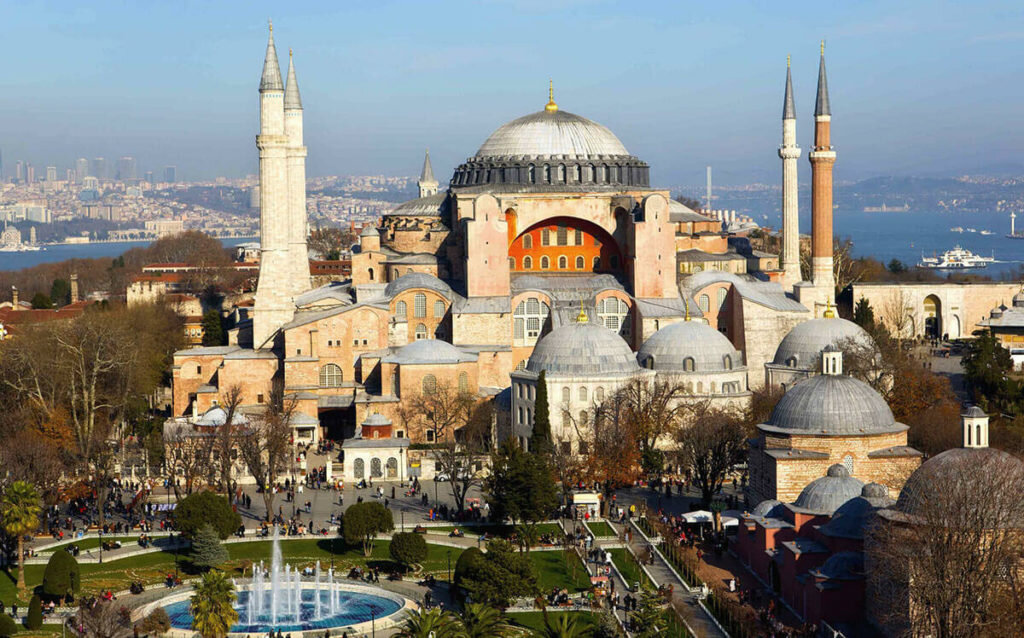 Построенная на месте церкви 4- го века, от которой ничего не осталось, собор Святой Софии с тех пор является центром в Стамбуле (бывший Константинополь). Великая церковь теперь является музеем, но так было не всегда. На протяжении веков она служила опорой греческой православной церкви, а затем – исламской мечетью. Вторая церковь была разрушена пожаром во время беспорядков в Никае в 532 году, хотя остатки ее можно увидеть и сегодня. Собор Святой Софии, который можно увидеть сегодня, был построен между 532 и 537 годами и является одним из величайших сохранившихся примеров византийской архитектуры. Самое большое притяжение к древней церкви – впечатляющий купол диаметром 102 фута, который достигает 182 футов в небо. Другими потрясающими характеристиками собора Святой Софии являются бесчисленные мозаики, Ложа императрицы, Мраморная дверь, Ложа султана, Библиотека Махмута I и Мраморные банки.