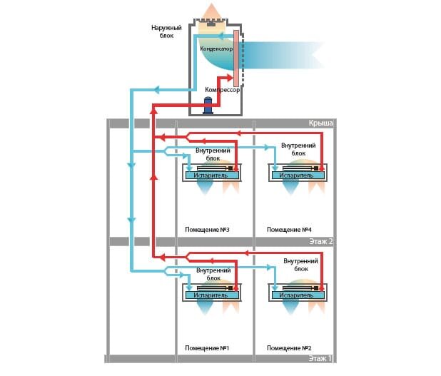 Это лишь несколько преимуществ из всего множества положительных моментов VRF систем. Последовательность работы холодильного цикла мультизональной системы остается традиционной. Один или несколько компрессоров, расположенных во внешнем блоке, сжимают холодильный агент и в парообразной фазе, с температурой +60…+100 ℃, подают по системе фреоновых трубопроводов в теплообменник конденсатора. Чаще всего применяется конденсатор воздушного охлаждения (намного реже – водяного охлаждения). Теплообменник воздушного охлаждения находится во внешнем блоке и обдувается мощными осевыми вентиляторами. По мере движения холодильного агента по трубопроводам теплообменника он охлаждается, потом конденсируется и немного переохлаждается (на +5…+8С). После конденсатора жидкий холодильный агент, но все еще не холодный (+30…+40 ℃), по трубопроводам выходит за пределы наружного блока и далее по ним же через разветвители подается на каждый внутренний блок. На входе в блок холодильный агент дросселируется в ЭРВ и с определенным расходом поступает в теплообменник внутреннего блока. Агрегатное состояние холодильного агента на входе во внутренний блок, примерно: 85% жидкий и 15% парообразный. Оно сильно зависит от температурного режима воздуха, который необходимо поддерживать в помещении, где установлен данный блок. Температура холодильного агента может составлять 0…+15 ℃, причем это не граничные значения возможной температуры. Теплообменник внутреннего блока обдувается воздухом, который находится в помещении и холодильный агент, находящийся внутри трубок теплообменника, кипит, превращаясь в парообразный, и немного перегревается на 5-8 ℃. Далее холодильный агент поступает в компрессор на всасывание, и цикл повторяется.