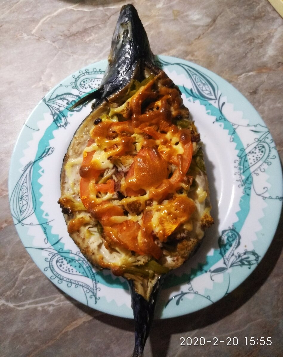 СКУМБРИЯ ЗАПЕЧЁННАЯ С ОВОЩАМИ🐟🐟🐟 Рыба по этому рецепту получается просто фантастически вкусная!!!! А готовиться моментально , да и съедается тоже быстро😂😂😂 Скумбрия берется не потрошенная, с головой, чистить её будем сами))) и начнём разрезать вдоль хребта со спинки, т.е. наоборот. Аккуратно вырезаем хребет и достаем внутренности не повредив брюшко. Получилась такая " лодочка". Внутри её протираем полотенцем, чтобы рыбка была сухая и чистая. Выкладываем на противень, застеленный бумагой, на брюшко. Солим, перчим и начинаем наполнять начинкой наши " лодочки". Лук, порезанный полукольцами Перец, я брала свой, замороженный, ложила не размораживая Цветная капуста, тоже своя, замороженная Помидоры полукольцами Сверху сделала сеточку из майонеза смешенного с горчицей И в духовку на 180°С на 30-40 мин Проще уже не куда😂😂😂 Рыбка получается очень нежная, вкусная, да и выглядит отлично. Такую можно и на праздничный стол подать😉😉😉 Приятного аппетита!!!! Готовьте с удовольст