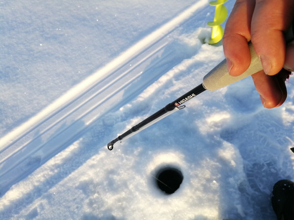 На полках магазинов полно зимних катушек разных модификаций, но иногда хочется порыбачить на такую удочку, которой она была во времена дефицита, когда катушек было не найти. Эта статья посвящена моим бескатушечным удочкам для блеснения. На данный момент у меня есть пара удильников на судака, которые для разнообразия я использую в своих рыбалках на Обском водохранилище. Общие преимущества удилищ с мотовилом, на которых не устанавливается катушка, заключаются в их малом весе и высокой чувствительности. Есть и минусы - переходы от лунки к лунке с такими вариантами удочек становятся дольше, но при определенной сноровке можно быстро менять точку лова. Зимнее удилище HIGASHI PAIKU Этот удильник я взял на судачка. Достаточно мощная зимняя "палка", настоящий "кол", не гнется вообще. Удочка имеет большой тюльпан, пару крючков для наматывания лески. Выглядит очень аскетично, имеет прямую ручку, место для упора пальца, а также страховочное кольцо. Из преимуществ такой удочки - разнообразие хватов