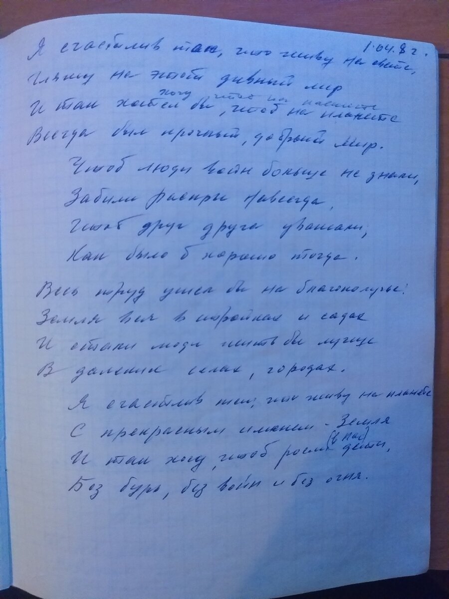 Я счастлив так , что живу на свете. Гляжу на этот дивный мир И так хотел бы , чтоб на планете Всегда был прочный, добрый мир. Чтоб люди войн больше не знали, Забили распри навсегда, Чтоб друг друга уважали; Как было б хорошо тогда. Весь труб ушел бы на благополучье, Земля вся в ............ и садах И стали люди жить бы лучше В дальних селах, городах. Я счастлив тем, что живу на планете С прекрасным именем - Земля И так хочу, чтоб росли дети, Без бурь, без войн и без огня Дата : 1.04.8г. К сожалению одно из слов понять не смог . Может быть вам удастся ?