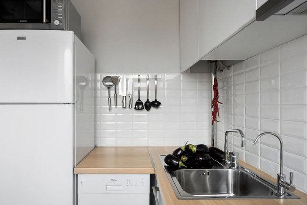 Мебель на кухне в светлых тонах, а также плитка и стены, что делает кухню более просторной и светлой, на кухне имеется вся необходимая техника. Единственное, что плитка на полу темная, как по мне, на такой плитке все будет видно и придется ее мыть каждый день.