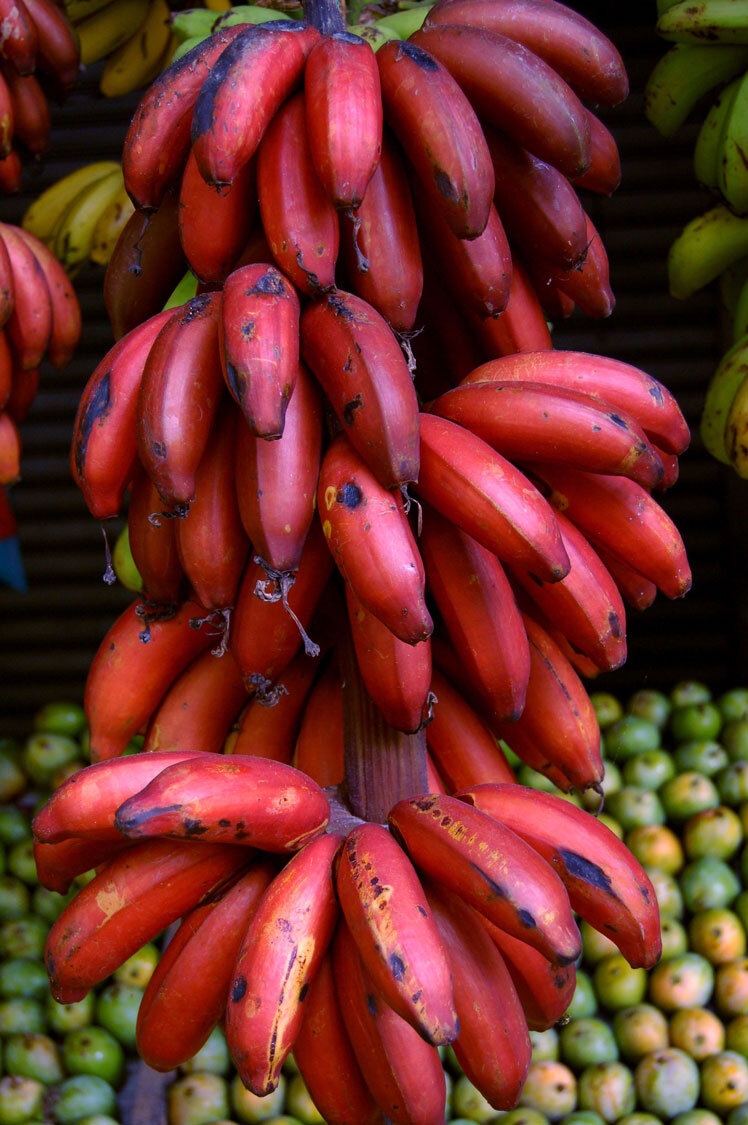 Время от времени в супермаркетах можно встретить бананы красного цвета. Некоторые пройдут мимо такой экзотики, предпочтя привычный жёлтый банан. А некоторые, наоборот, решатся совершить покупку. И не прогадают. Основное отличие красного банана от жёлтого – цвет его кожуры. Главная причина такого цвета – всё тот же пигмент бета-каротин, который в большом количестве содержится в моркови. Растут бананы красного цвета на Ямайке, Коста-Рике и на Сейшелах. Считается, что сейшельские красные бананы – самые вкусные. Причём идеальный вариант – съесть бананчик сразу же, как он будет сорван. Почему же красные бананы большая редкость в наших магазинах? Всё дело в том, что они очень быстро портятся. Употреблять в пищу красные бананы надо буквально в первые же сутки после того, как они будут сорваны. Да и отличается красный банан от своего жёлтого собрата цветом кожуры и размером. Красные бананы немного меньше тех, что скрываются под жёлтой кожурой. Сам же очищенный красный банан по своему цвету