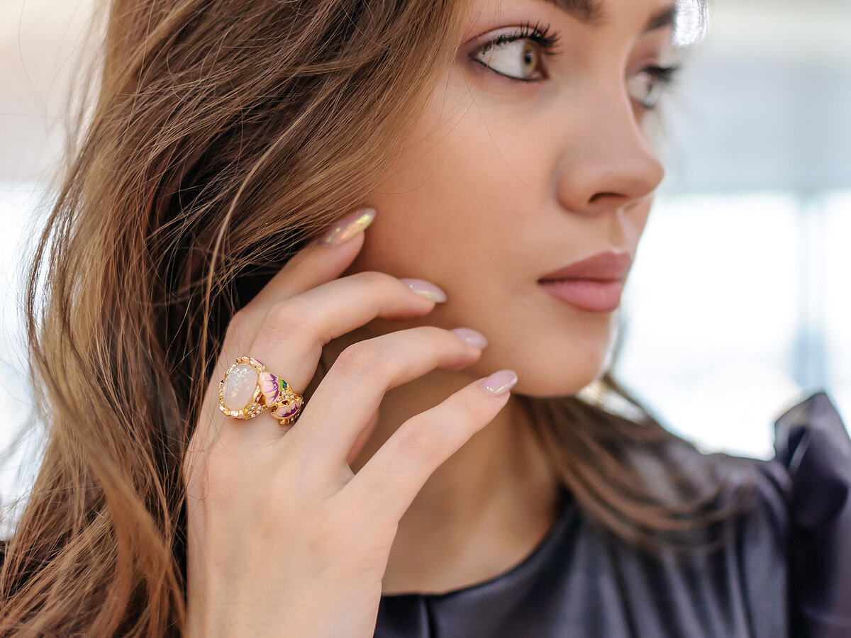 Доставка в Алтайский край чуть больше месяца. Кольцо пришло упакованное в zip-пакет и почтовый конверт с воздушно-пузырьковой пленкой. Я взяла размер 6 и оно идеально подошло на 16-й российский. Это просто бижутерия: колечко выполнено из меди, но я бы предпочла, чтобы покрытие было под серебро, а не под золото. Главный камешек и не камешек вовсе, я так понимаю, это имитация опала из застывшей смолы и блесток с голографическим блеском. Боковые