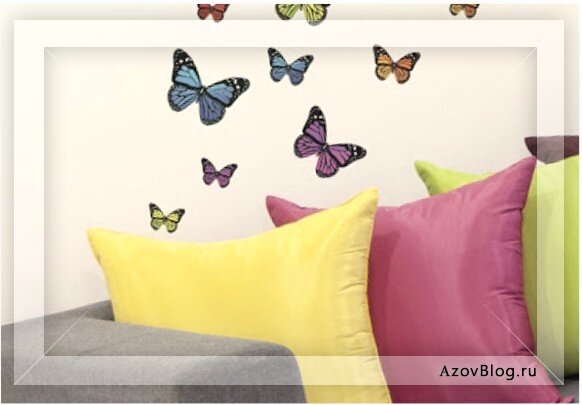 Стенное панно из бабочек, конечно, можно сделать, купив готовые виниловые наклейки. Но из 1 метра виниловой пленки можно сделать уникальное панно или на кухне, либо в другой любой комнате и самому. Чтобы оно получилось масштабным, надо вырезать побольше бабочек самых разных размеров. Для начала понадобится трафарет «бабочки». Его очень просто сделать при помощи фотошопа, а если им вы не владеете, шаблон совершенно бесплатно скачивается из Интернета. Затем нужно его распечатать на обычной фотобумаге формата АЗ. Далее вырезаем шаблоны, прикладывая их к задней стороне виниловой пленки. От количества вырезанных бабочек зависит и размер самого панно. На следующем этапе выложите панно из бабочек на полу. Потом делаете соответствующую разметку на стене, например, рисуете спираль. Можно создать и объемное панно, освободив от защитной пленки лишь клеевую часть по центру бабочки. Тогда такой «мотылек» приклеивают только по центру, а его крылышки будут шевелиться при малейшем сквознячке. А если