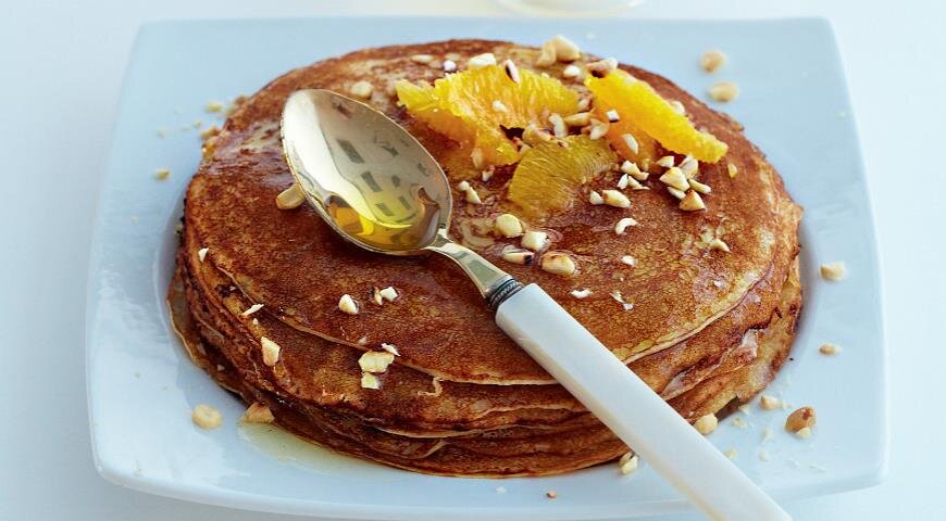 Шаг 1Очистите 2 крупных апельсина от кожуры. Затем острым ножом вырежьте филе, удаляя волокна и перегородки. Переложите филе в миску.Шаг 2В отдельной посуде смешайте 200 г просеянной муки и 0,5 ч. л. разрыхлителя. Добавьте 1 яйцо, взбитое с щепоткой соли до пышной пены, и 150 мл молока.Шаг 3Размешайте тесто, удаляя комочки, и разведите его, помешивая, еще 100–150 мл молока. Когда тесто станет однородным, добавьте 200 г рикотты.Шаг 4Слейте образовавшийся апельсиновый сок и смешайте его с 2–3 ст. л. медаШаг 5Испеките блины на раскаленной сковородке с добавлением растительного масла. Выкладывайте их стопкой, промазывая медово-апельсиновой смесью. Украсьте филе апельсина и рубленым жареным фундуком. Подавайте горячими.