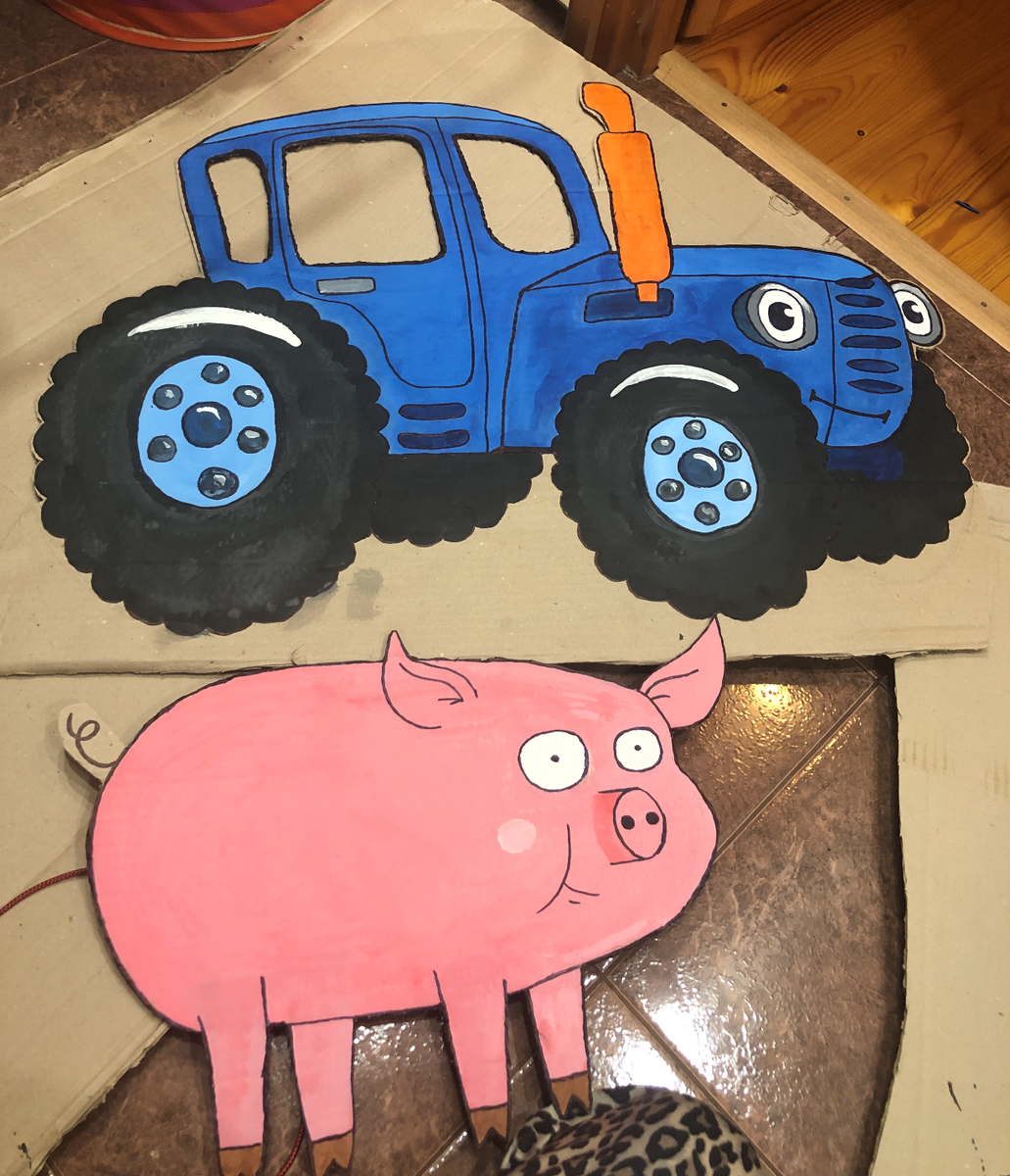 В детстве ходила в художественную школу, рисовать не очень умею. Но срисовываю хорошо 👌 Особенно, когда приходит вдохновение. Вдохновение пришло перед вторым днём рождения сына. Он любит мультик #синий трактор , и вообще трактора большие и игрушечные. К слову, у папы Вани 4 больших трактора🚜. А у Вани 10 игрушечных. Первый на очереди, конечно, был трактор. Мини видео с этапами создания. Потратила по 1-2 часа в день в течение одной недели пока ребёнок спит, и трактор и 3 животных были нарисованы. Получились в точности как в мультике. Да? Использовала картон из под коробки холодильника и краски 🎨сына. Праздник прошёл на 5 +. Фигуры остались живы после двухлеток и 4 летки. А теперь трактор висит над кроваткой. И иногда вытаскиваю животных из кладовки. Очень понравились сыночку. ❤️ И конечно, на сладкое двухъярусный торт с синим трактором.