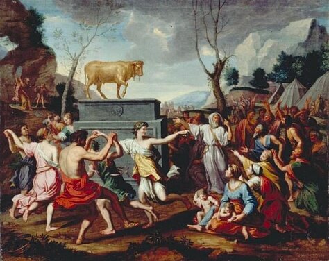 Однажды, когда Моисей вновь отправился за очередной поддержкой к еврейскому Богу, исчезнув на сорок дней, терпение евреев лопнуло. Евреи взбунтовались и потребовали у Аарона сотворить им зримого Бога: «Встань и сделай нам Бога, который бы шел перед нами». «И Аарон сотворил им... Золотого тельца». Скорее всего, из того же самого египетского золота, которое предусмотрительные евреи вынесли из Египта.