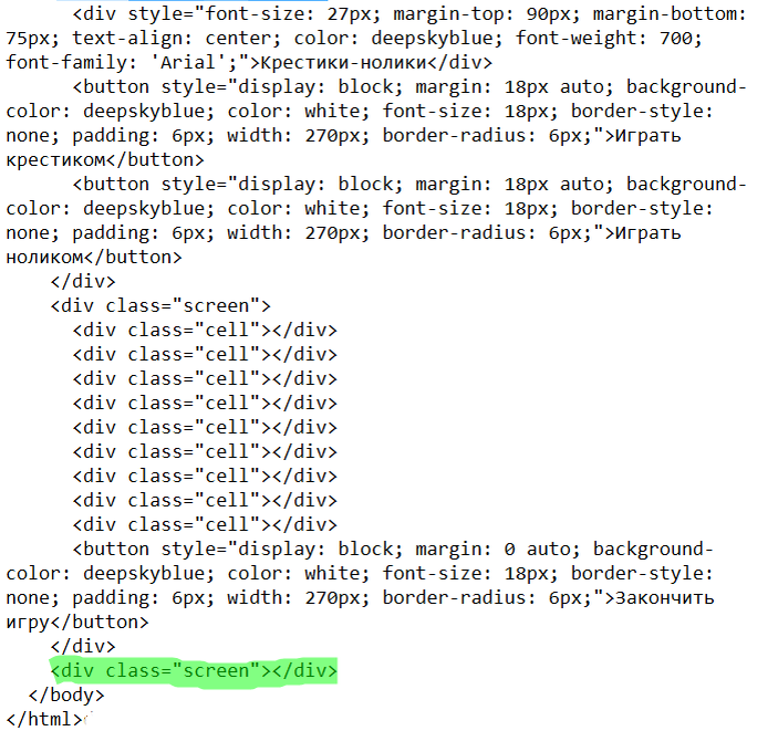Продолжаем наши экзерсисы. В этом уроке мы создадим третий экран. Он простой, как и первый. Допишем еще один элемент в конец нашего файла для третьего экрана: Я сразу указал класс. На этом экране у нас должно быть сообщение о том, кто выиграл партию и одна кнопка "Начать сначала". Предлагаю не мудрить и просто скопировать содержимое первого экрана. При это мы изменим текст надписи, уберем одну кнопку и изменим ее текст: Я еще добавил класс hidden ко второму экрану, чтобы не мешался. Смотрите, что получилось: С третьим экраном мы справились очень быстро! Кстати, не волнуйтесь по поводу надписи, мы будем менять ее в зависимости от результата игры. Теперь давайте "причешем" код. Дело в том, что у нас с вами получилось много повторяющегося кода, а это нехорошо. Помните, как у нас получилось с ячейками, когда для того чтобы поправить стиль ячейки нам приходилось делать это 9 раз. Смотрите, все имеющиеся у нас кнопки мы копировали, а это значит, что их стили одинаковы (на самом деле почти од