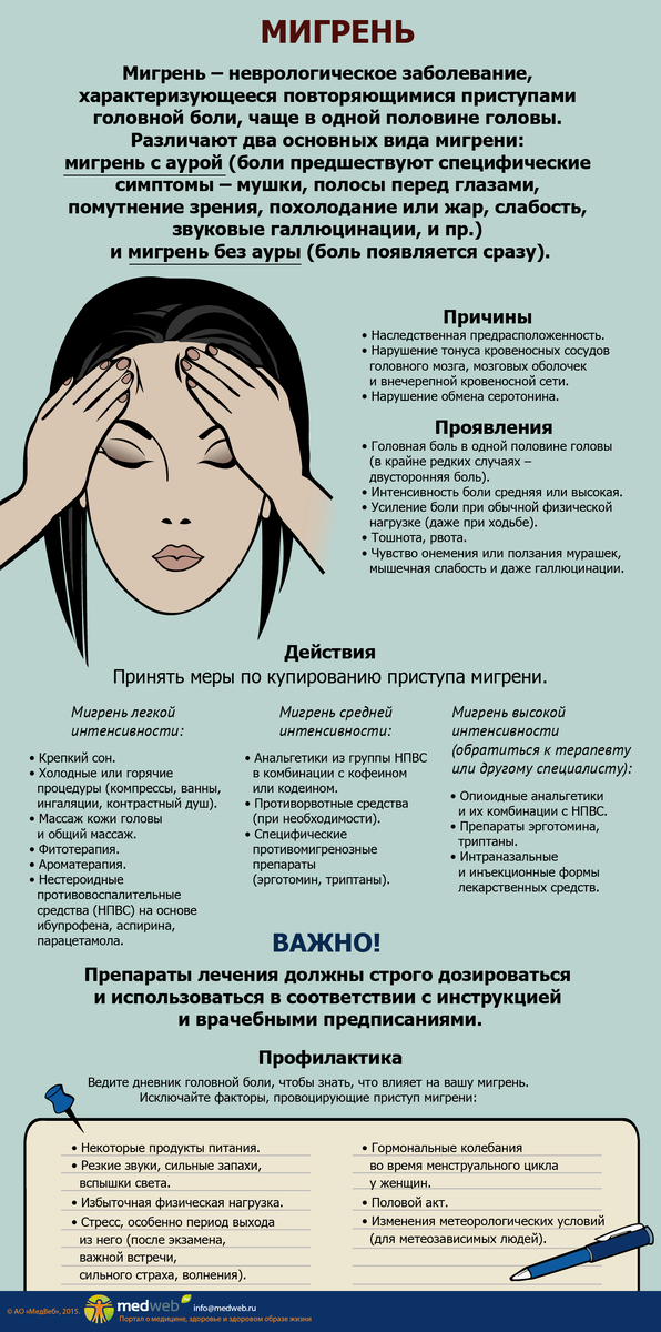 Боль при мигрени отличается, как правило, односторонней локализацией, высокой интенсивностью, пульсирующим характером, свето, звукобоязнью, продолжительностью от 4 до 72 часов. Характерно, что в ряде случаев мигрень сопровождается комплексом расстройств, которые предшествуют приступу непосредственно головной боли ( аура): туман перед глазами, покалывание, онемение, нарушение речи, и даже кратковременная потеря зрения или двигательной способности.