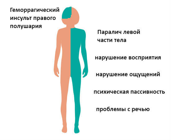 При выраженном поражении правого полушария головного мозга вначале общемозговые симптомы преобладают над очаговыми, и наблюдается молниеносное и внезапное, (апоплектиформное) их возникновение и прогрессирование.