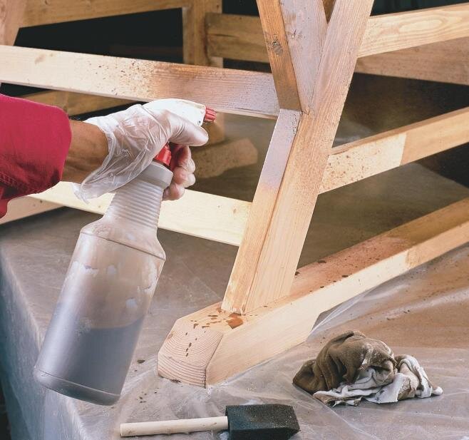 Оказывается, нужно взять бутылку от стеклоочистителя и налить туда морилку. Она же водорастворимая, так что такой распылитель отработает нормально.