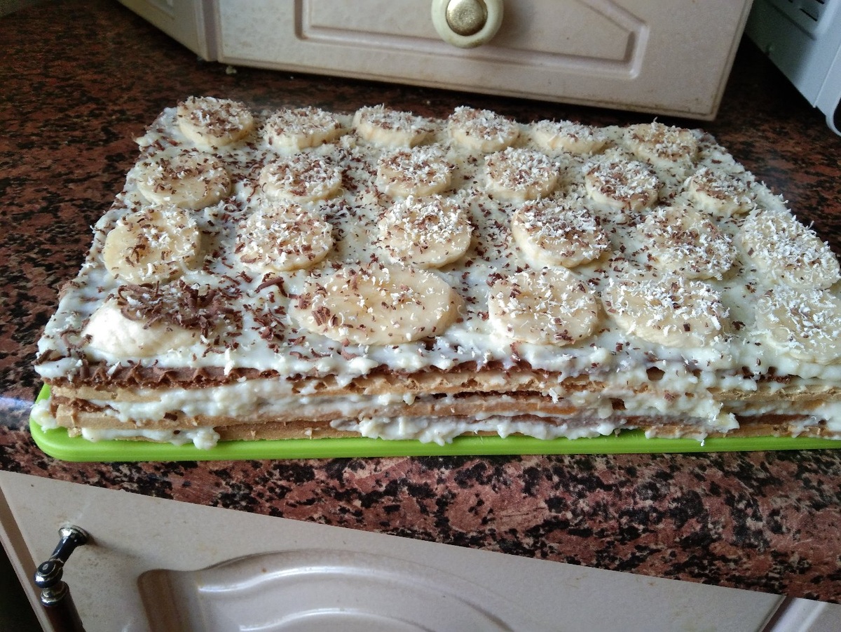 Вафельный торт с кремом, бананами и шоколадной крошкой 😍 Ингредиенты: - вафельные коржи - банан 🍌 - шоколад 🍫 Для крема: - молоко 500мл - сахар 125гр - мука 4 ст.ложки - яйца 2 шт - сливочное масло 120гр - пакетик ванелина Приготовление крема! Молоко поставьте на плиту греться В глубокой ёмкости смешайте яйца,сахар,муку и ванилин Добавьте не много молока из кастрюли и хорошо перемешайте до однородной массы Когда молоко на плите почти закипит , влейте яйчную смесь , постоянно перемешивая Дождитесь первых пузырьков и сразу снимайте, иначе пригорит Когда заготовка не много остынет,добавьте сливочное масло,и хорошо перемешайте Готовим торт! Достаньте коржи и намазывайте их кремом. Последний корж намажте кремом, сверху положите банан 🍌 Шоколад 🍫 натрите на тёрке и посыпьте получившийся торт! Оставьте на пару часов и приятного аппетита 🤗