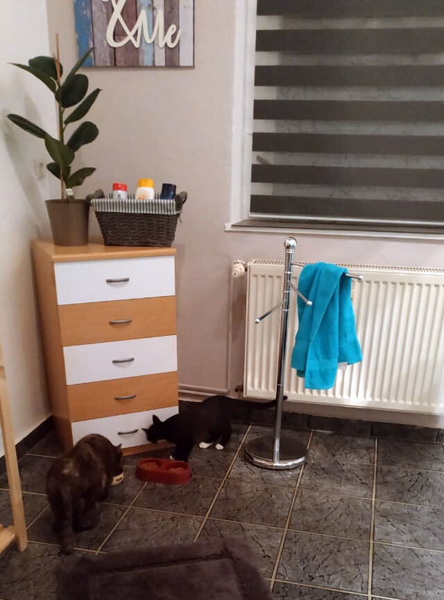 До Германии мы доехали к 18 вечера. Останавливались в небольшом городке, чтобы недалеко от маршрута. Место оказалось очень тихим. Мало машин и людей, и никаких магазинов. Зато в номере, в этот раз у нас был гостевой дом с букинга, была ванна метров 10 квадратных. Мы сразу туда счастливо отселили кошек вместе с лотком. Кошки счастливо отселились. Вообще у нас отработалась целая технология по заселению. Сначала муж шел и забирал ключи, я оставалась в машине, в основном из-за Тора, который весьма переживательный парень. Потом возвращался к нам, сообщал что жилье найдено и уносил пакеты с кормом, мисками, лотком и прочим животным барахлом (Тор, например, путешествовал со своей огромной собакой из Икеи). Первыми в помещение уносились кошки. Последними из машины уходили я и Тор. Дома был свой обряд, надо было первым делом засыпать лоток и выпустить кошек, которые сначала обходили помещение, а вовсе не рвались в лоток. Потом всех кормили, а потом, слегка выдохнув, мы садились перекусить сами