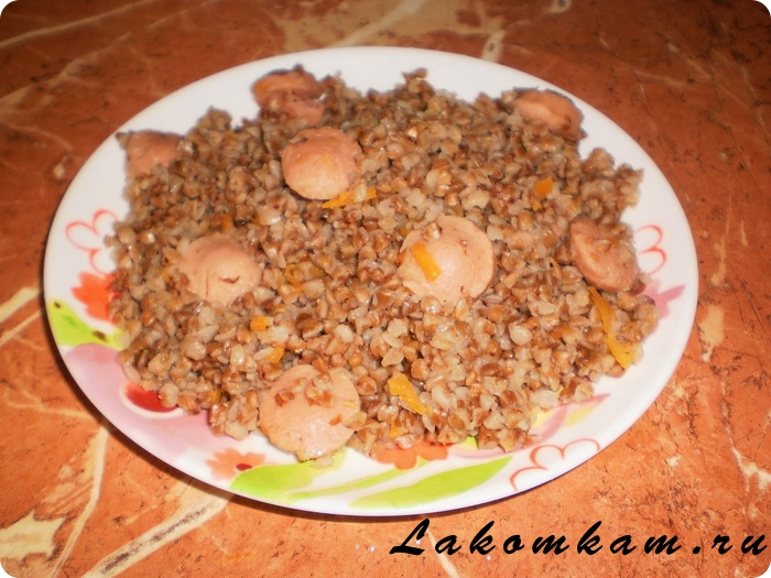 Ингредиенты: гречневая крупа — 250 грамм; вода — 400 миллилитров; репчатый лук — 1 штука; морковь — 1 штука; сосиски — 3 штуки; соль и специи — по вкусу; растительное масло — для жарки.