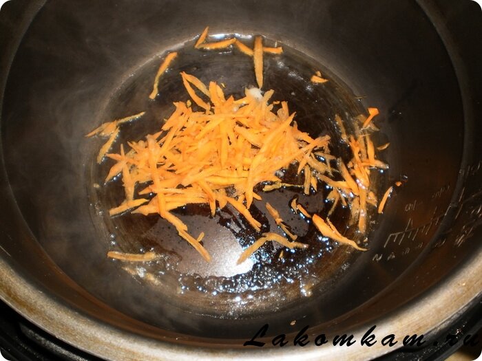 Приготовление гречки с сосисками в мультиварке. Морковь трём на тёрке, затем обжариваем в мультиварке с мелко нарезанный луком (я делала без него) на программе «барбекю» около 5 минут.
