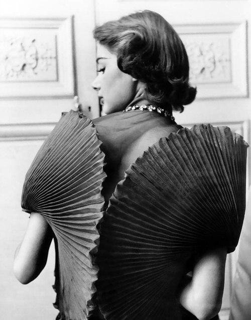 Девушка в одежде от парижского модельера и дизайнера по имени Эльза Скиапарелли. Именно Эльза в своё время создала такое понятие, как «прет-а-порте», после чего основала свой собственный дом моды. Год 1951.