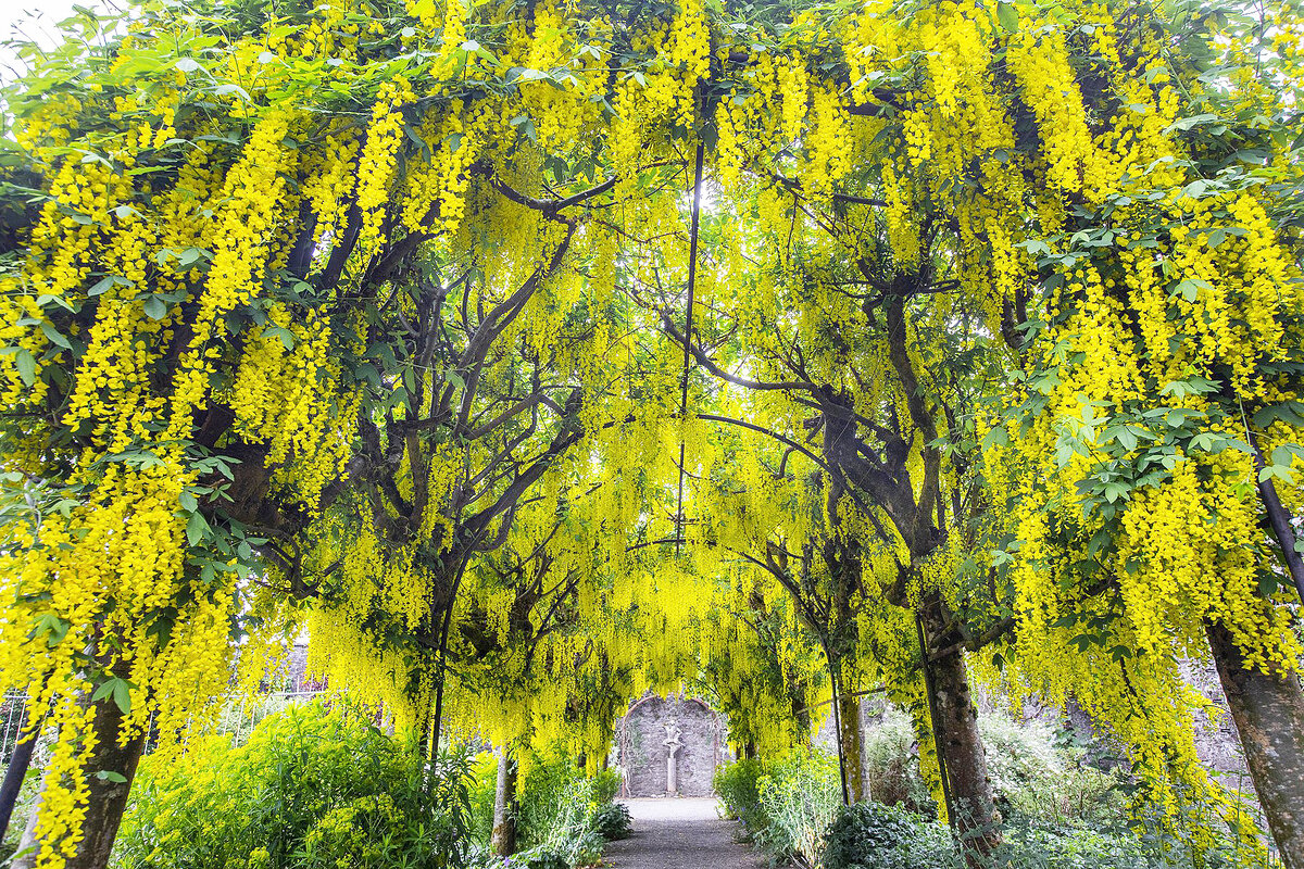 Этот кустарник радует глаз. может украсить вашу перголу или беседку, раскинув в мае - начале июня солнечные грозди своих соцветий. Отлично смотрится и как одиночное деревце. Это лабурнум, или бобовник Возможно Вы слышали, что бобовник в средней полосе России ежегодно обмерзает по уровню снегового покрова. Это справедливо для лабурнума анагировидного. Он действительно не переносит морозы ниже -15С. А вот лабурнум альпийский зимостойкостью радует гораздо более, хотя и не столь популярен среди садоводов. Вырастает в условиях Ленинградской области до высоты 3-4 метров. Даёт хороший ежегодный прирост. Цветёт в начале июня длинными жёлтыми кистями (до 40 см.) Любит солнечные светлые места и рыхлую плодородную почву без застоя влаги. Плохо переносит открытые ветра. Погубить бобовник можно обрезкой. Не любит он подобных вмешательств. Зато в благоприятных условиях сохраняет декоративность долгие десятилетия! Это растение благоприятно для почвы, и привлекает опылителей, но все его части ядов
