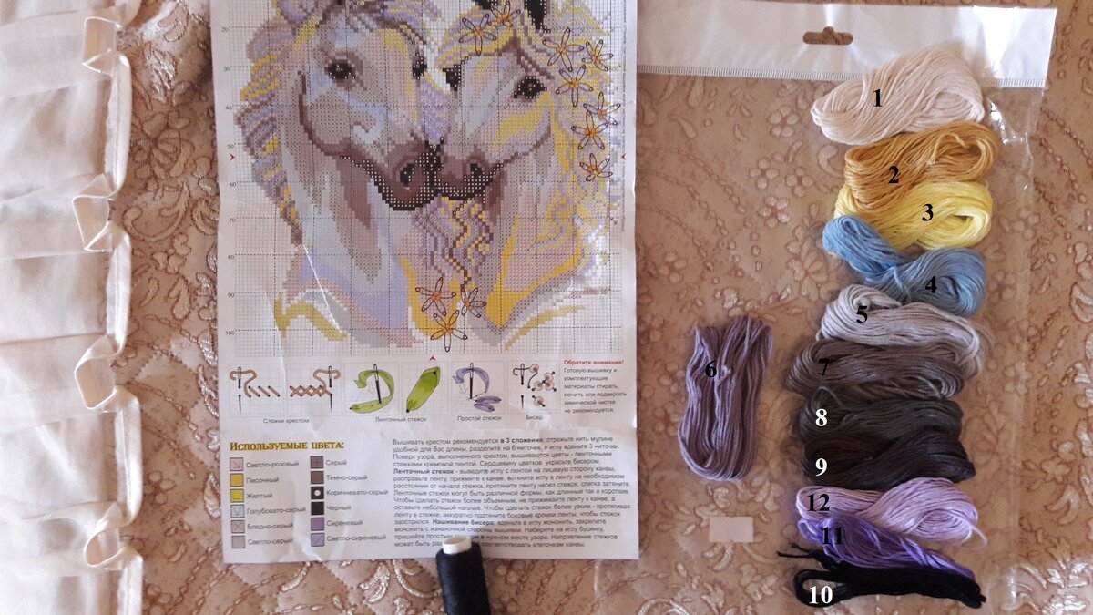 Здравствуйте дорогие читатели! После того, как нашла свою давно заброшенную вышивку и взглянула на изображение будущей картины, не смогла убрать ее обратно. Подумала, что непременно нужно завершить начатое. Тем более, что результат обещает быть очаровательным. В этой статье я опишу с чего начала вышивку, какие приемы, используемые ранее, вспомнила. Итак, моя работа началась с определения соответствия оттенков нитей условным обозначениям, представленным в инструкции. Впервые купила такой набор, в котором не было пронумерованных ниток. После того, как от производителя получила уточняющие сведения, сделала нумерацию сама. Для этого взяла картон. Сделала отверстия по количеству, соответствующему количеству нитей и пронумеровала. В отверстия продела нити. Так проще и быстрее ориентироваться в цветах. Так как меня не устроило качество канвы, прилагаемой к набору, пришлось вместо нее купить канву более лучшего качества. В начале работы, когда все материалы готовы, я делаю на канве разметки. В
