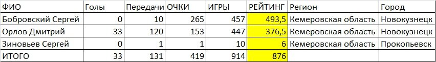 Новокузнецкий "Металлург" является настоящей кузницей хоккейных талантов России. Долгие годы этот клуб выступал на уровне суперлиги и КХЛ. В сезоне 1999/2000 даже стал бронзовым медалистом чемпионата. Но из-за финансовых трудностей в настоящее время выступает на уровне ВХЛ. Также в этом городе имеется команда "Кузнецкие Медведи", выступающая в МХЛ. Рейтинг формируется следующим уровнем: Рейтинг игрока=(1,0*ОЧКИ + 0,5*МАТЧИ) *у вратарей в категорию очки попадают выигранные матчи РХРР = сумма рейтинга игроков из этого региона Наибольших успехов в индивидуальном плане добился вратарь Сергей Бобровский, который даже не был задрафтован. С 18 лет Сергей выступал в родном "Металлурге" перед тем как отправиться за океан. Он нередко вытаскивал матчи для своего клуба. В 2010 году Бобровский отправился покорять НХЛ, подписав контракт с "Филадельфией". При этом на драфте его имя не фигурировало. В "Филадельфии" ему пришлось конкурировать со своим соотечественником Ильей Брызгаловым, которого под