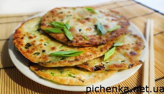 В Китае популярны тонкие блинчики Конг ю бинг с зеленым луком. Тесто элементарное – без молока и яиц, а вместо растительного масла в него