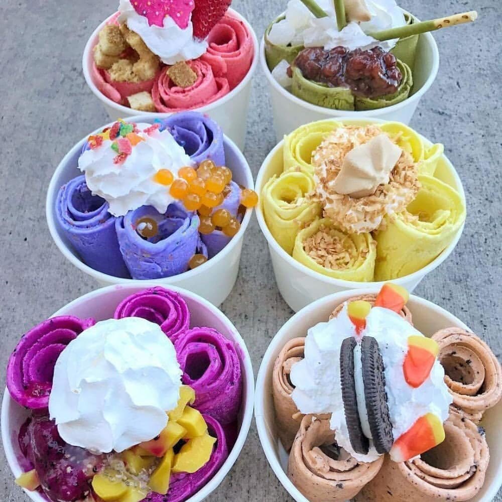 Тайское мороженное азиатское лакомства .В виде мини ролов потрясающей подачей . Довольно не обычный способ приготовления у тайского мороженного . Его жарят да да вы не ослышались . Но мастерам чтобы приготовить это не обычное мороженное тратят на это дело где -то 3 м. Как его готовят. Сначала на ледяную доску выливают молоко и кладут туда фрукты в качестве красителя . Чтобы мороженное получилось более сладким в него добавляют топпинг и присыпки .Чтобы вкус казался лучше туда добавляют кокосового молока .