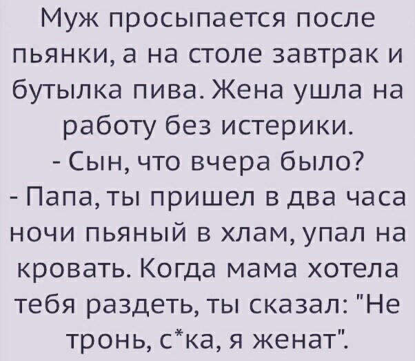 Всем привет. Подписывайся на канал и ставь мощный лайк, потому что дальше будет еще интересней и смешней. Муж всю ночь гулял с друзьями, пришел домой после пьянки, жена естественно была злая на своего супруга, ведь дозвониться до него было трудно, однако одна фраза пьяного мужа решила весь конфликт, и даже жена осталась довольна. Знакомство с девушкой может повлечь за собой слепоту, когда смотришь в кошелек, потому что это приводит к большим тратам, а порой к неоправданным. Современные отношения между парнем и девушкой может стать проблемой современного характера. Миловидные девушки могут обвести вокруг пальца, что и случилось с парнем ниже, его просят обо всем забыть. Признаюсь, мой день проходит также, устаешь от лежания, идешь расстилаешь теплую постельку и сливаешься с ней в единое целое. Постелька никогда не предаст. А вот тут парень хотел познакомиться с девушкой, однако его оттолкнула одна изюминка потенциальной жертвы. Парень решил не скрывать и не молчать о видимых изъянах