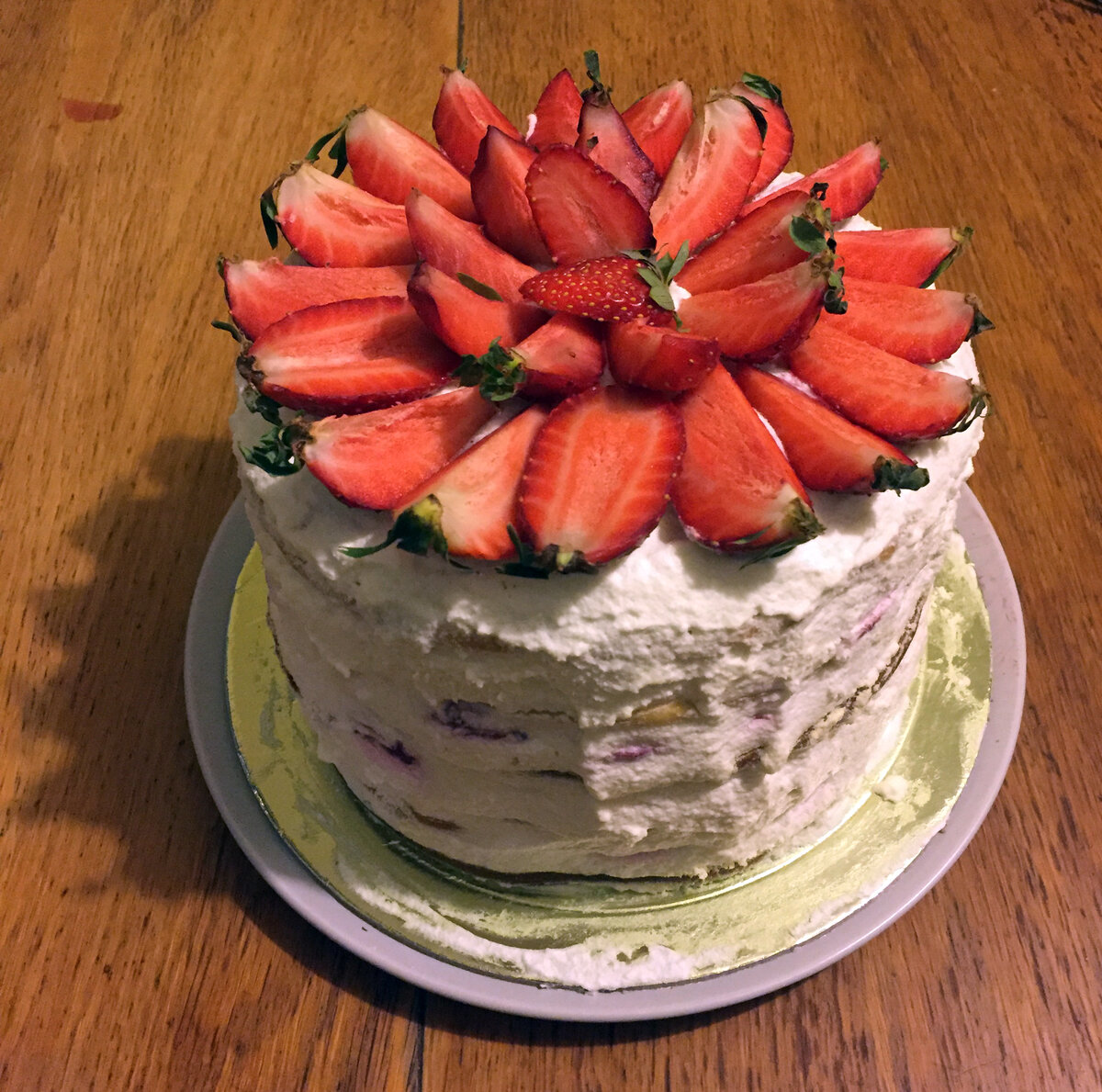 Оставшийся крем распределяем по поверхности торта и достаем отложенную для украшения клубнику. Тут уж дело вашей фантазии, разместите вы ее на торте целиком, или как-то порежете.