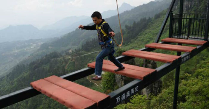 Хотите немного адреналина так, чтоб дыхание захватывало, по коже бежали мурашки и хотелось вздрогнуть? -Да Отлично, потому что здесь собраны самые крутые и даже безумные аттракционы со всего мира. Готовы вцепиться во что-нибудь от страха?)) Пятисот футовый мост в Китае Вы наверняка слышали про стеклянный мост в Китае. Так вот это его конкурент. Этот мост короче стеклянного, но ощущения от него не менее захватывающие. Каждого смельчака защищает страховка и это совсем не лишние меры. Дело в том, что идти Вам на высоте 200 метров, а иногда даже прыгать. Балки, из которых состоит мост, расположены на разном расстоянии друг от друга от 50 до 120 см. Сможете прыгнуть на один с лишним метр, когда прямо под вами пропасть, иногда даже затянутая туманом? Возможно это кажется легким, но даже у устойчивых к высоте туристов здесь сдают нервы. Одно неверное движение и ты уже летишь вниз, недолго летишь, конечно - спасибо страховочному тросу )) А еще здесь есть реальный риск потерять обувь - на ней