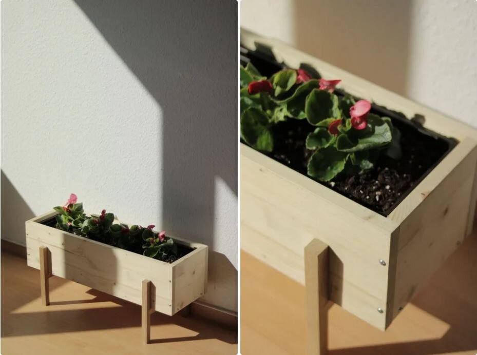 Дачно-огородный сезон все ближе, пора готовиться. Предлагаю вашему вниманию небольшой цветничок, с изготовлением которого справиться даже девушка. Использовать такой цветник можно и в доме и на улице. Шаг 1. Собираем корпус цветника Сборка корпуса цветника не должна вызвать затруднений. Размеры указаны ниже, нарезать можно самому или попросить это сделать в магазине при покупке. Шаг 2. Нарезаем заготовки для ножек При помощи пилы, стамески вырезаем наши ножки, их всего две штуки. Расстояние между стойками делаем равным ширине нашего ящика для цветов. Шаг 3. Собираем ножки цветника Ножки склеиваем, даем высохнуть. После этого шлифуем их и корпус цветника. Шаг 4. Устанавливаем ножки на корпус После того как вы приложили ножки к корпусу, притяните их струбциной, чтобы не сбежали. Прикручиваем ноги на саморезы. Шаг 5. Покраска ящика для цветов В завершении красим наше изделие антисептическими средствами, пусть послужит по дольше. При засыпке грунта не забываем про дренаж. Спасибо!