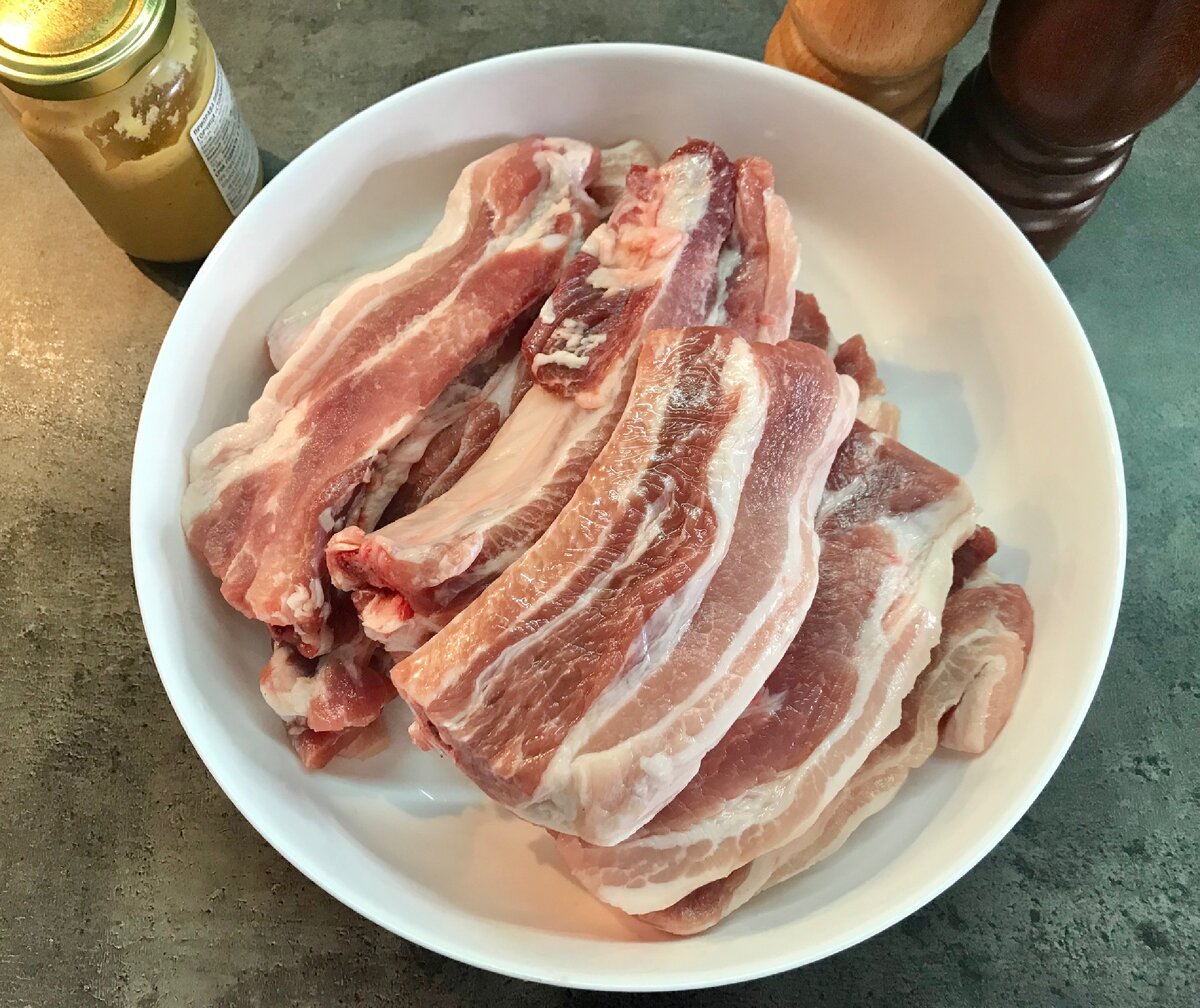 Ребрышки разрезали, сложили в глубокую миску, добавили горчицу, соль, перец и хорошенько их натерли со всех сторон, затянули пищевой плёнкой и поставили в холодильник минимум на 2 часа, чтобы они промариновались.