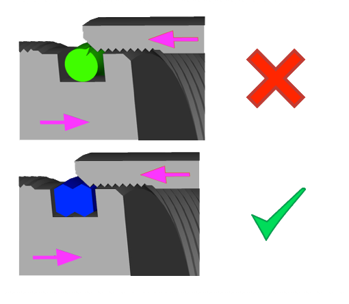 Результативность уплотнения определяется правильностью конструкции посадочной канавки и выбором кольца. Его необходимо выбирать с максимально возможным сечением, которое допустимо конструкцией уплотняемых поверхностей. Следует учитывать, что под давлением металлические изделия имеют свойство упругого удлинения. Поэтому может иметь место увеличение зазора, это пространство должно быть заполнено прокладкой.