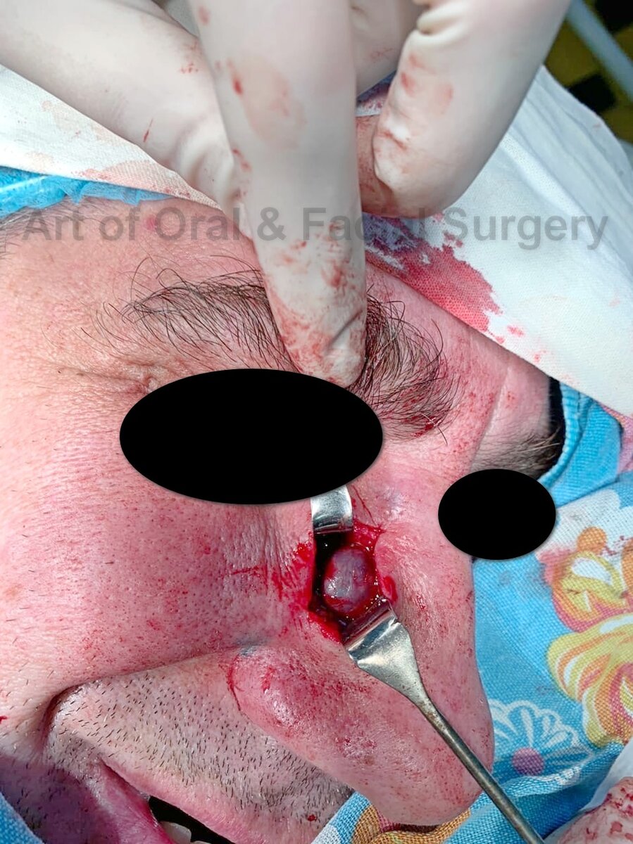 VIII Nasal Cysts and the Facial Cleft Cyst Theory. Annals of Otology, Rhinology & Laryngology. 1953;62(1):84-92. doi: 10.1177/000348945306200108 Клинический случай 1. Больной М, 45 лет, обратился с жалобами на новообразование в области носогубной складки. Было проведено удаление новообразования наружным доступом. Киста плотно спаяна с надкостницей верхней челюсти.