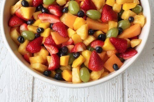 Ингредиенты: 1 свежий спелый ананас 1 свежая спелая мускатная дыня 4 свежее спелое манго 900 г свежей клубники 600 г зеленого винограда без косточек 1,5 стакана свежей черники или голубики 3-5 стаканов сахарной пудры Приготовление: Нарежьте все фрукты, кроме винограда и черники. Выложите все в миску и смешайте с сахарной пудрой. Подавайте салат охлажденным.