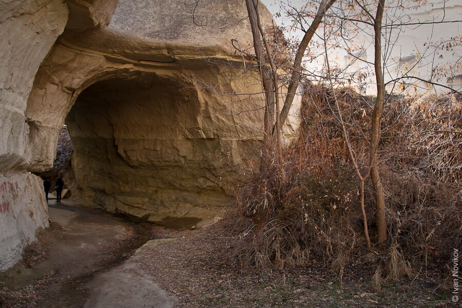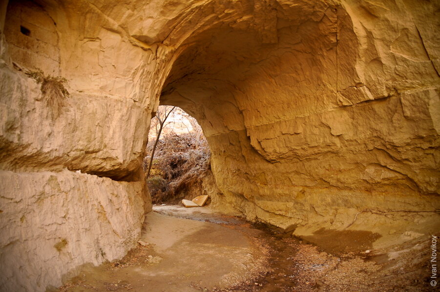 Чем глубже мы уходили вверх, тем больше срастались отвесные стены скал, обрастая растительностью и образуя во многих местах причудливые арки: Об успехах местных достопримечательностей, таких как высота или длина рассказывают вот такие таблички: Повсеместно отвесные скалы изрезаны вот такими причудливыми узорами. Сначала я в упор не понимал что это такое и зачем: Каменные полочки для горшков с цветами? Сушилки? Оказалось все намного проще. Это- голубятни. Местные использовали помет птицы Мира для удобрения своих огородов: Чтобы яблонька уродилась: Да виноград на лозе сыпался с гроздей: В некоторых местах ущелья ощущаешь себя ковбоем из фильма "Золото Маккены": Здесь кто-то рыл себе целый спортзал, но задор, видимо, кончился: Илья- медвежатник снова вторгается в древнее жилище: А это- древний колодец. Глубоко в скалу прорыт узкий прямоугольный проход, длины которого я оценить не смог. Перед ним стоит перегородка, благодаря которой в таком колодце скапливается холодная водица: На протяже