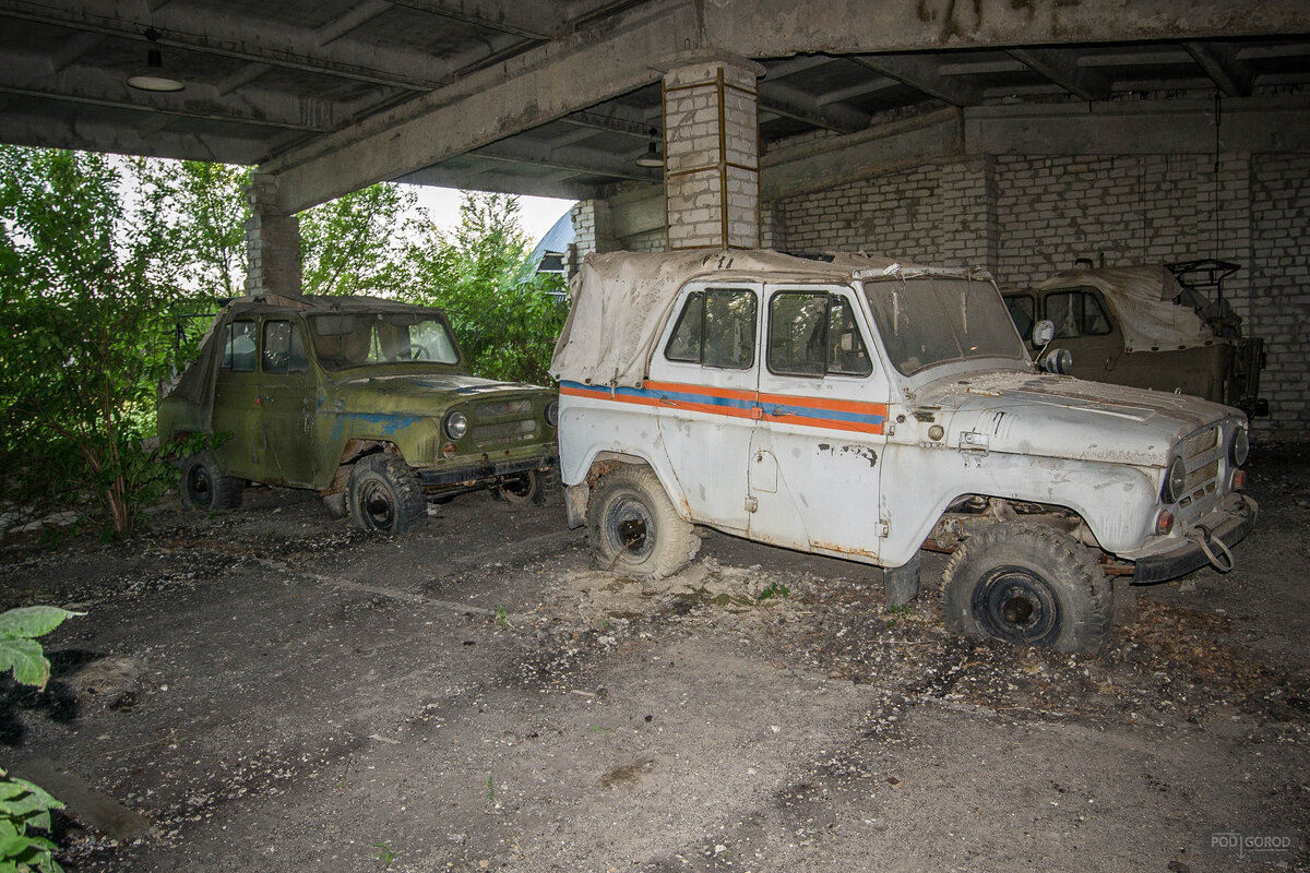 На одной из баз МЧС, в полуразрушенном ангаре, поросшем колючками и бурьяном, притаились несколько автомобилей. Непонятно, сколько они тут простояли? Еще больше вопросов вызывает тот факт, что автомобили не на специальных подставках, необходимых при длительном хранении. Это привело к тому, что колеса начали уходить под асфальт. Внутри было настолько пыльно, что я не смог взглянуть на пробег. За то все рычаги и приборы вроде как на месте. Пока мы осматривали автомобили, чуть было не встретились с их хозяином, который рвал сорняки в нескольких десятков метров от нас. Что бы не оказаться замеченными, мы не стали открывать капот, дабы оценить состояние двигателя. Незаметно выйдя с территории базы, мы направились к главному въезду, с которого была видна старая, советская заправка. Когда я уже попытался пролезть под воротами, к нам неожиданно подошел тот самый мужчина и в жесткой форме пресек наше намерение, мотивировав это тем, что перед нами не какая то "заброшка", а настоящая база х