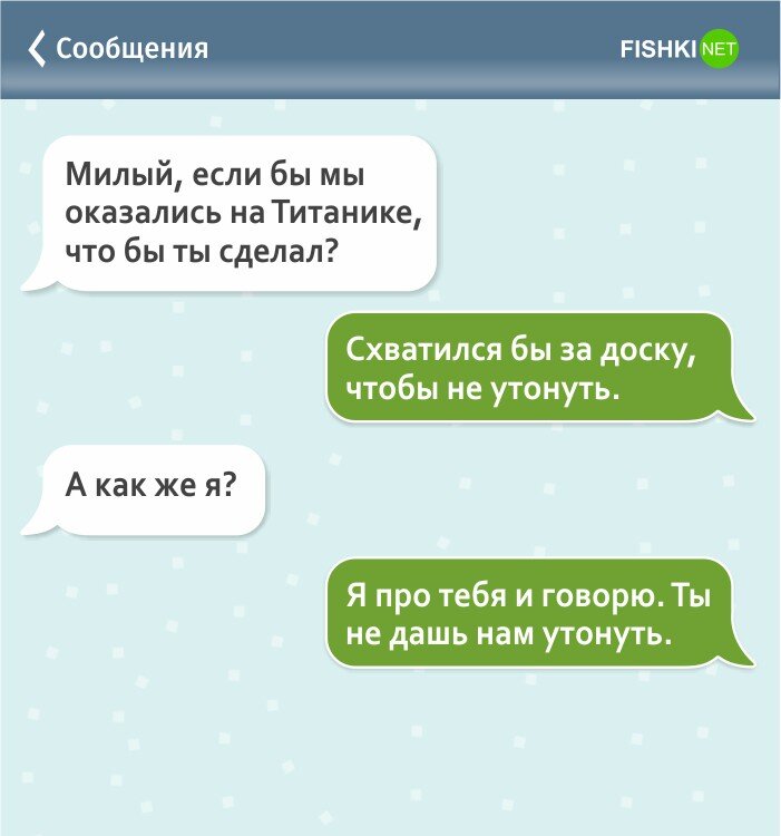 Всем хорошей рабочей недели друзья, а главное чтобы вашу работу оценивали по достоинству. Как известно, понедельник день тяжелый, поэтому мои смешные подборки уже на подходе, и я думаю что вы сможете поднять себе этим настроение. Очередная моя подпорка будет вновь посвящена семейным отношениям, ведь там много юмора и нелепых фраз. Поехали. Жена решила удариться немного в романтику, вспомнила романтический, но трагическим концом фильм Титаник. Супруга решила помечтать, и представить как муж будет ее спасать при крушении корабля. Только вот ее романтические баталии быстро закончились после ответа мужа, и возможно даже был развод... А вот вам наглядный пример того, как девушка из мухи может сделать слона на пустом месте. Девушка спрашивает у своего парня хорошо ли она выглядит, и он отвечает ей "да", однако ей не очень нравится его интонация. Жена отправилась в супермаркет за покупками, и неожиданно мужу приходит смс-ка, где жена спрашивает, куда он хочет на море или в лес. Муж обрадов