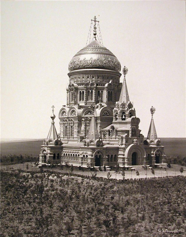 Проект храма разработал академик архитектуры Роберт Робертович Марфельд, а возведение храма велось на средства местного фабриканта И. Воронина. В церемонии закладки собора участвовали императрица Мария Фёдоровна, цесаревич Николай Александрович и другие члены царской семьи. Храм был рассчитан на 1400 человек и представлял собой величественное строение, с трёх сторон окружённое крытой галереей и увенчанное огромным золотым куполом. Вся наружная позолота храма и часовни была выполнена сусальным золотом. Напомним, императорский поезд потерпел крушение в октябре 1888 года в районе Курской губернии. Когда поезд окончательно разворотило и под обломками оказалась вся царская семья, Александр III, обладавший недюжинной физической силой, на своих плечах поднял крышу вагона и держал её до тех пор, пока