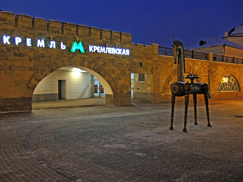 В конце июля 2018 года в Казани на улице Баумана около входа на станцию метро "Кремлевская" был установлен арт-объект "Конь-страна". Автор - скульптор Рафаэль Сайфулин. Фигура коня украшена множеством мелких деталей, отсылающих зрителя к культуре татарского народа. На спине коня на круглом постаменте располагается татарская деревня с минаретом, по периметру этого постамента идет строчка из татарской народной песни. На груди коня можно увидеть надпись на татарском языке, которая в переводе означает "Счастья тебе". Фото сделаны в декабре 2018 года. Прогулки по Казани.