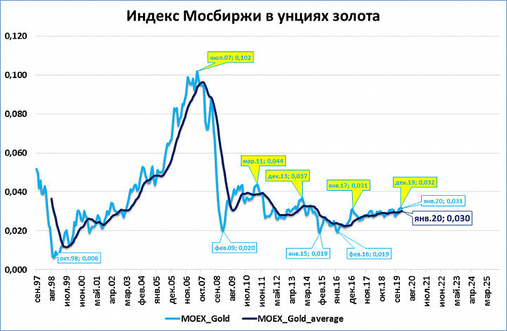 Мы уже писали о том, что несмотря на номинальные исторические рекорды, индекс Мосбиржи в реальном выражении ещё далёк от значений 2008 года. Ещё скромнее результаты индекса, если пересчитать его в унции золота. График показывает, во сколько унций золота можно оценить инвестированные в индекс ММВБ в сентябре 1997 года 100 рублей (тогда, до деноминации, это было 100 000 рублей). Сейчас индекс в золоте не только ниже 2008 и 2011 годов, но уступает даже максимумам 2013 года (и даже начальным значениям сентября 1997 года). Темпы роста индекса могут быть опережающим индикатором экономической активности (требует дальнейшего исследования). Последний цикл замедления закончился в октябре 2019 года и сейчас темпы роста индекса в золоте повышаются.