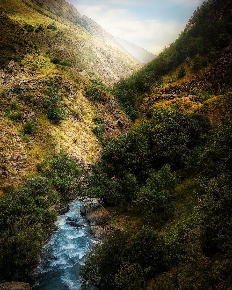 "Лучше гор могут быть только горы". В.Высоцкий Как это получилось? В августе 2017 года довелось мне провести две недели в замечательной и очень гостеприимной Грузии. Ущелье - это одно из самых фотогеничных мест на планете, очень сложно сделать плохой кадр, за исключением двух случаев: Почему это важно? Потому что величие любых гор, ущелья, даже холмов, что придает на снимке объем и перспективу передается свето-тенью - что-то должно быть ярче, что-то темнее. Так как одновременно столкнуться с двумя этими проблемами просто невозможно, поэтому мне не повезло только с тем, что солнце было почти в зените, а времени как обычно было мало. Поэтому обработка в данном случае будет несколько более художественной, чем просто цветокоррекция и контрасты. Где это? Дорога до этого места занимает около четырех-пяти часов от Тбилиси, при этом половину времени по узкой грунтовой горной дороге без отбойников. К счастью, с погодой очень повезло и обошлось без дождей. Уверен, что в дождь мне было бы некомф