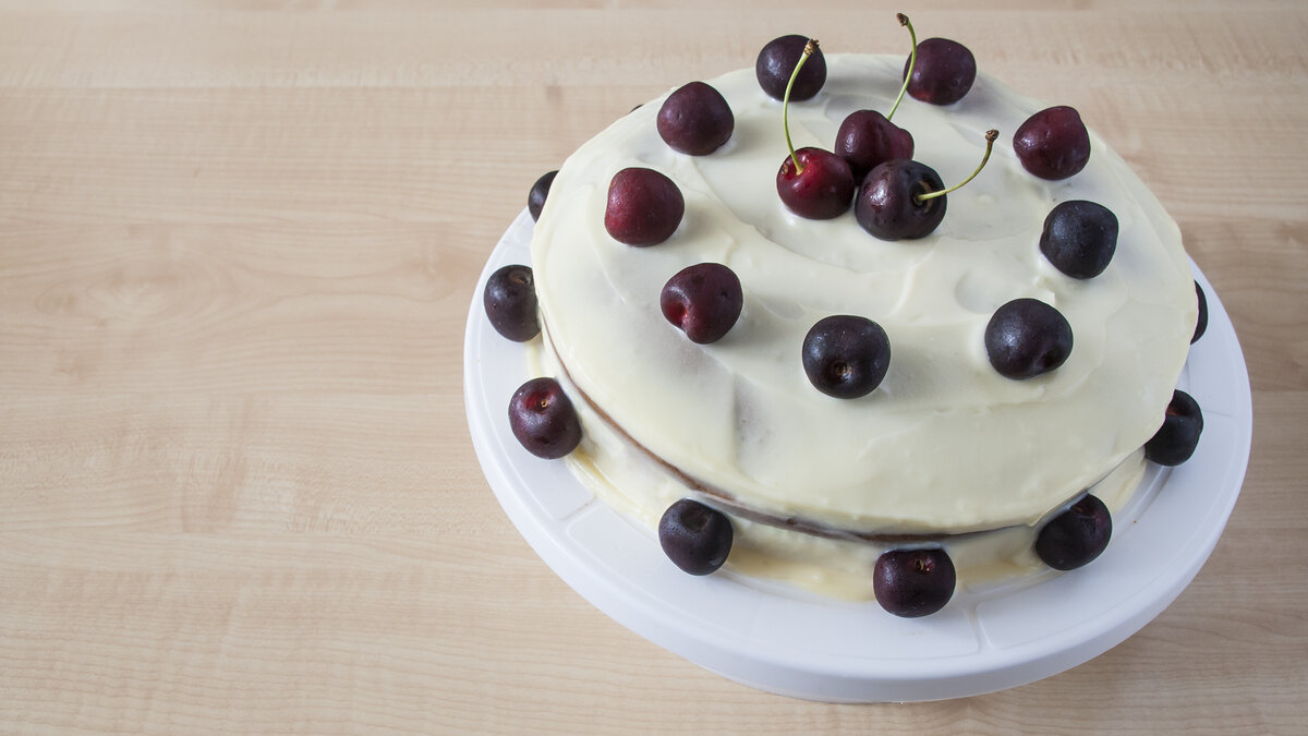 Обилие сочных ягод превращает традиционную выпечку в еще более нежные и ароматные десерты, которые приходятся по душе сладкоежкам, а также помогают пополнить запас витаминов. Домашний торт с черешней/вишней) - это необыкновенно вкусный, нежный, очень легкий в приготовлении торт со сметанным кремом и вишнями Нам понадобится: Масло - 100 гр Сахар - 150 гр Яйца - 3 шт Мука - 200 гр Какао - 2 ст/л Разрыхлитель Крем: Сгущенка - 1 банка Сметана - 400 гр Загуститель для сливок - 40 гр Вишня/черешня Способ приготовления: 1. В мягкое сливочное масло добавляем сахар, взбиваем до кремового состояния 2. Затем добавляем яйца и взбиваем еще примерно 3-4 минуты 3. Муку смешиваем с какао и разрыхлителем 4. Просеиваем муку в тесто, перемешиваем до однородного состояния 5. Выпекаем корж в заранее разогретой духовке 20-25 минут при 180° 6. В сметану добавляем сгущенку, перемешиваем 7. Добавляем загуститель для сливок (или для сметаны) и взбиваем до состояния крема 8. Готовому коржу даем остыть и разре