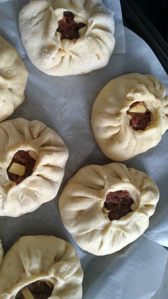 Для начинки: Яйцо,соль,воду, подсолнечное масло(по вкусу кто то наливает0.5 стакана,кто то 1 стакан. Я беру 0.5 так как дети любят вак- балеш, но вкуснее когда 1стакан😁)все перемешиваем,добавляем разрыхлитель,ещё раз перемешали. В смесь насыпаем муку и размешиваем, муку добавляем до тех пор пока тесто станет упругим и не будет липнуть к рукам. Накрываем тесто тряпочкой и убираем в стронку. Готовим начинку : берём фарш(у меня конина),картошку моем чистим, режем кубиками как на манты. Добавляем картошку к фаршу,солим , перчим добавляем специи по вкусу. Все хорошо перемешиваем руками. Берём тесто. Тесто делим на 12 частей и раскатываем лепешки. В лепешку кладём начинку и по краям формируем наши вак-беляши. Духовку ставим на 180 градусов и отправляем беляши на 30-40 минут до румяной корочки. Когда приготовится на шапочку каждой можно сверху положить сливочное масло или сверху шапок в кружочки залить бульеном(1ст.ложку). Приятного аппетита!!! В следующей публикации будет видео готовки б
