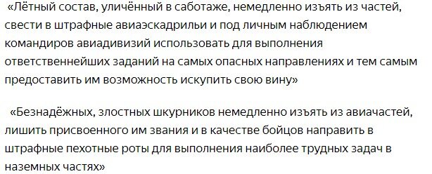 О существование штрафных батальонов в Красной армии известно всем. О них пишут историки, вспоминают выжившие участники и снимаются фильмы. Отступление Красной армии, частые случаи дезертирства и трусости послужили толчком для создании штрафных батальонов. Штрафбаты начали появляться с 1942 года, после приказа Сталина "Ни шагу назад". Это был вынужденный шаг во спасение страны. По данным статистических исследований в штрафные роты и батальоны было направлено около 400 000 человек. Использование штрафников в воздухе вскрылось совсем недавно и по настоящее время остается не мало вопросов. Оказалось, что все материалы по их деятельности были строго засекречены, и только в 2004 году с части документов гриф был снят. Вместе с приказом №227 в воздушные силы была передана директива ВГК, где говорилось : В штрафные батальоны попадали прежде всего те, кто по мнению командования был уличен в трусости. Следующими следовали те, кому вменялось халатное отношение к технике . Но стоит отметить,