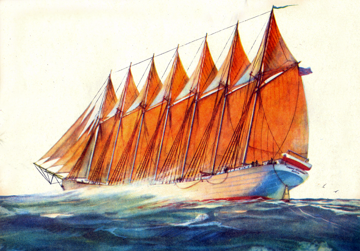 Но, пожалуй, самым любопытным парусником следует считать семимачтовую шхуну — единственное семимачтовое судно в мире.