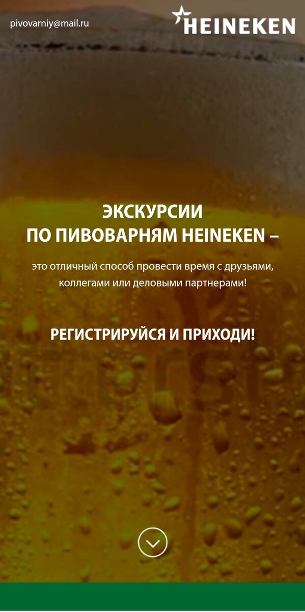 Экскурсии HEINEKEN проходят в 6 городах присутствия компании в России: Санкт-Петербурге, Нижнем Новгороде, Екатеринбурге, Новосибирске, Иркутске и Стерлитамаке АБСОЛЮТНО БЕСПЛАТНО! Проходим https://tour.heinekenrussia.ru/ РЕГЕСТРИРУЕМСЯ Программа Вход на пивоварню осуществляется только на основе списка зарегистрированных участников. При себе необходимо иметь документ, удостоверяющий личность. В соответствии с правилами безопасности пищевого производства просим Вас надевать одежду, закрывающую ноги и руки (брюки, кофты с длинным рукавом). В производственных цехах не допускается ношение ювелирных украшений (серьги, цепи, кольца) и часов. За день до экскурсии Вам будет звонить оператор, чтобы подтвердить Ваше участие. Всю подробную информацию узнавайте по электронной почте: pivovarniy@mail.ru. Продолжительность экскурсии ~ 90 минут