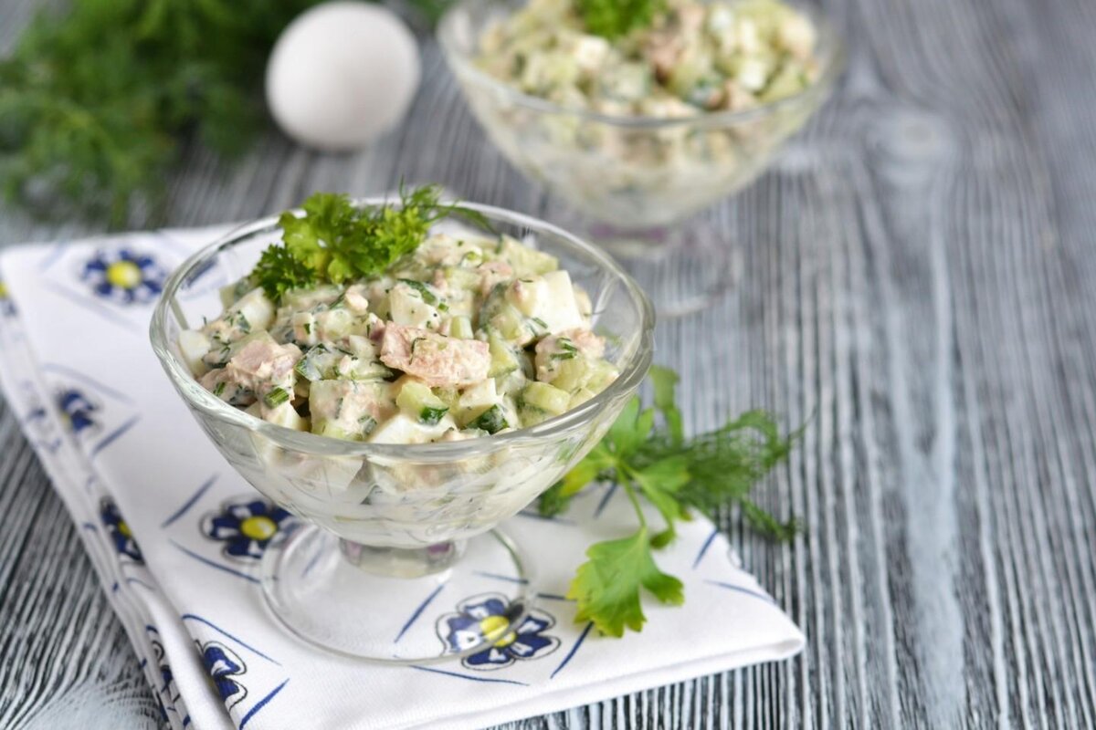Блюдо довольно питательное. Его одного будет достаточно на легкий ужин. Но и на праздничный стол подойдет. Салат с тунцом готовится очень просто, буквально на скорую руку. Этот рецепт является базовым вариантом. Другие варианты приготовления с дополнительными продуктами предлагаются в рубрике полезные советы. Блюдо можно изменять и дополнять. Например, чтобы еда была полезней, вместо майонеза сделайте заправку из оливкового масла. Время приготовления 25 минут Калорийность 138 ккал/100 г Ингредиенты (3 порции) · огурец свежий – 1 шт; · консервированный тунец – 1 банка (180 г); · куриные яйца – 2 шт; · майонез – 2 ст. л; · укроп – 20 г Подготовка ингредиентов Вкрутую варим яйца. Заливаем их холодной водой. Очищаем от скорлупы. Режем на маленькие кубики. Тунец вынимаем из банки и перекладываем в салатник. Разминаем. Жидкость из банки в салат не выливайте. Обсушиваем помытый огурец. Также нарезаем его небольшими кубиками. Измельчаем помытый укроп. Соединяем ингредиенты с тунцом в салатн