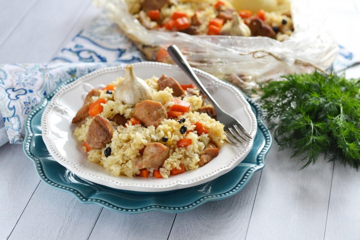 Почему я люблю готовить плов в рукаве. Удобно, быстро, стоять над кастрюлей не требуется. Рис получается идеальным, как говорится рисинка к рисинке, не слипшимся, не подгоревшим. Мясо тает во рту. Посуду мыть не нужно. Замечательный рецепт! Рекомендую! Время приготовления 1 час 30 минут Калорийность блюда 152 ккал/100 г Ингредиенты (6 порций) · рис – 400 г; · вода – 1 литр; · морковка – 1 шт; · мякоть свинины – 600 г; · куркума – 0,5 ч. л; · растительное масло – 2 ст. л; · паприка – 1/2 ч. л; · чеснок – 30 г (или 2 головки); · крупная луковица – 1 шт; · барбарис – 2 ч. л; · сухие специи – 1 ч. л; · соль – 1 ч. л с горкой Подготовка ингредиентов Несколько раз промываем рис в холодной воде. Выкладываем на дуршлаг. Даем стечь жидкости. Мыть рис следует не меньше 6 раз, пока вода не станет прозрачной. Очищаем луковицу от шелухи. Нарезать ее не нужно. Она понадобится нам целой. Чеснок промываем, сушим. Шелуху оставляем. Морковь чистим. Нарезаем тонкой соломкой или на четвертинки. Помыту